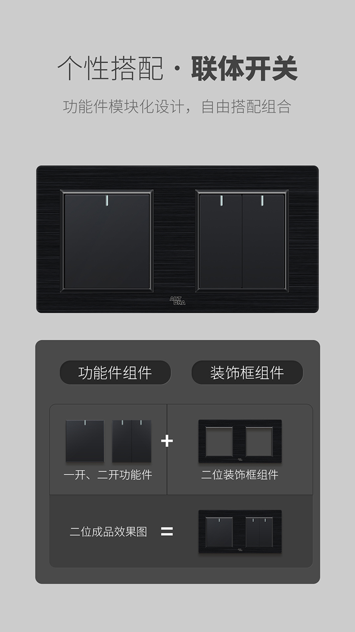 当然,联体开关的最大优点,就是可以自由组合、个性搭配所需的功能件,想要开关和插座装在一起,就可以装在一起!A77拉丝黑系列依然采用的是“功能件+组合外框+钢架内框”的设计,只要按照需采购相应位数的外框和内框。再按照使用习惯购买相应的功能件,即可完成自由组装开关。
