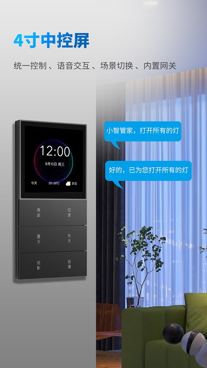 1、智能中控屏。集中式管理屋内照明、窗帘等智能设备;时尚大屏设计,界面清晰;语音交互,告别手动;内置网关。