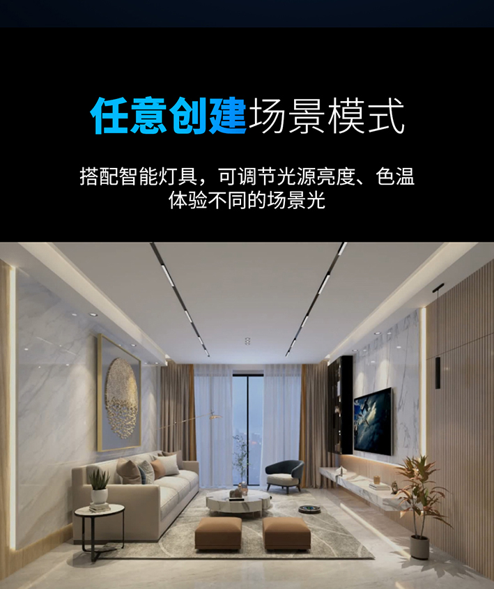 6、自定义场景模式。(1)回家模式:照明与窗帘智能联动,即一键打开室内所有灯,同时智能窗帘自动拉开。(2)离家模式:一键关闭室内所有灯,同时智能窗帘自动闭合。(3)观影模式:开启低照度背景光,营造电影院的真实场景。(4)夏天模式:色温偏冷,显得清凉。(5)冬天模式:色温偏暖,让人体验到温暖的感觉。此外,还有会客、浪漫等多种模式可以自由创建。