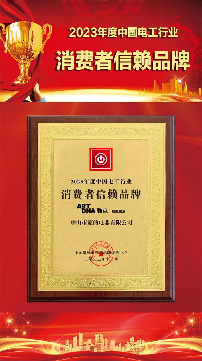 雅点获得的3大荣誉分别是:2023年度中国电工行业“十大知名品牌”、“消费者信赖品牌”、“十大创新产品”。