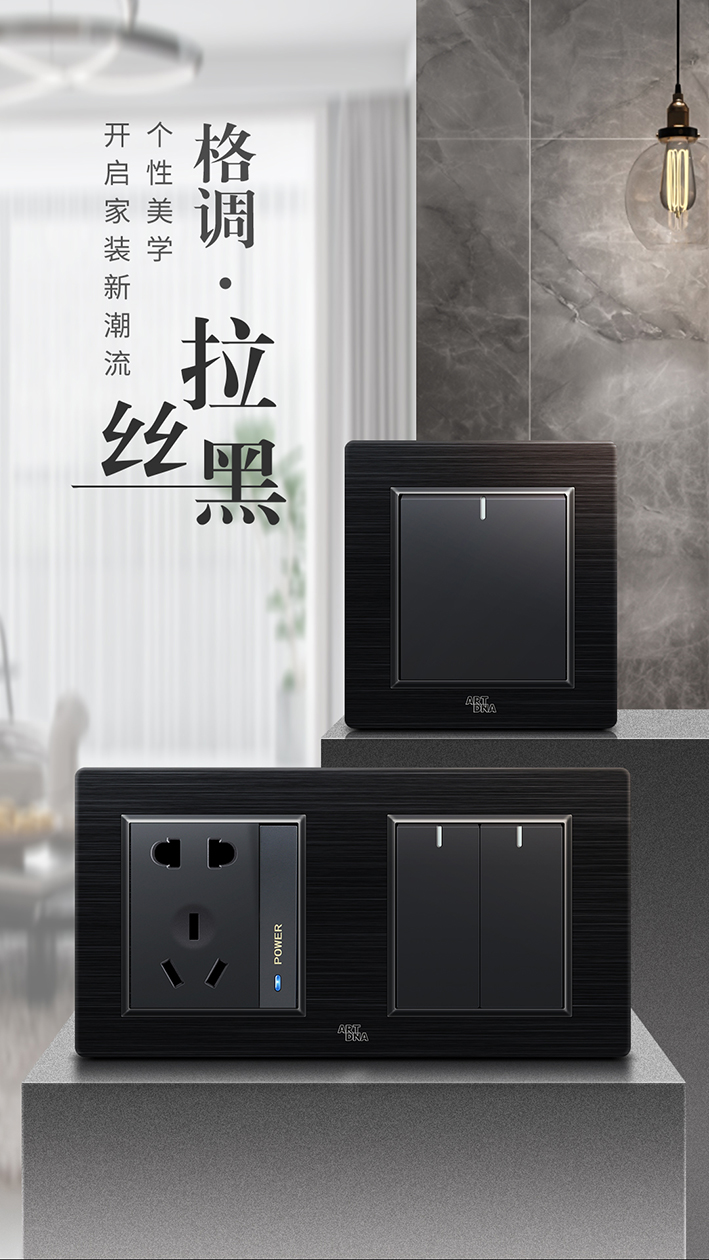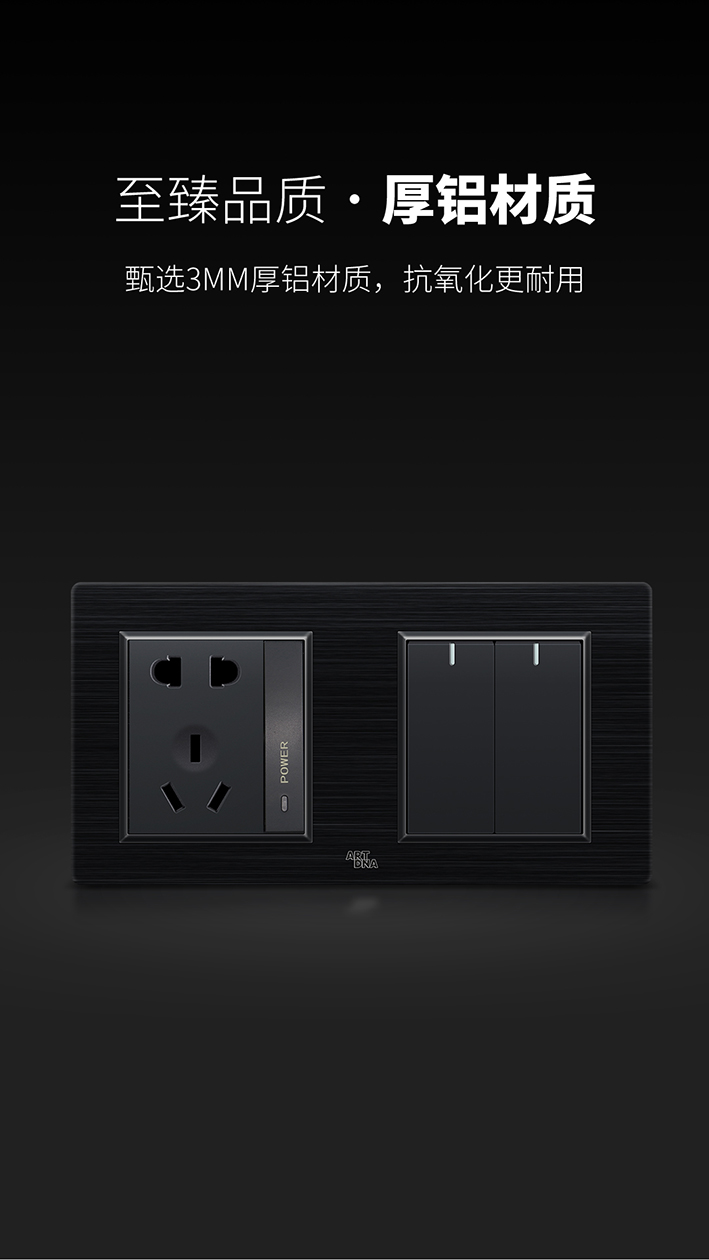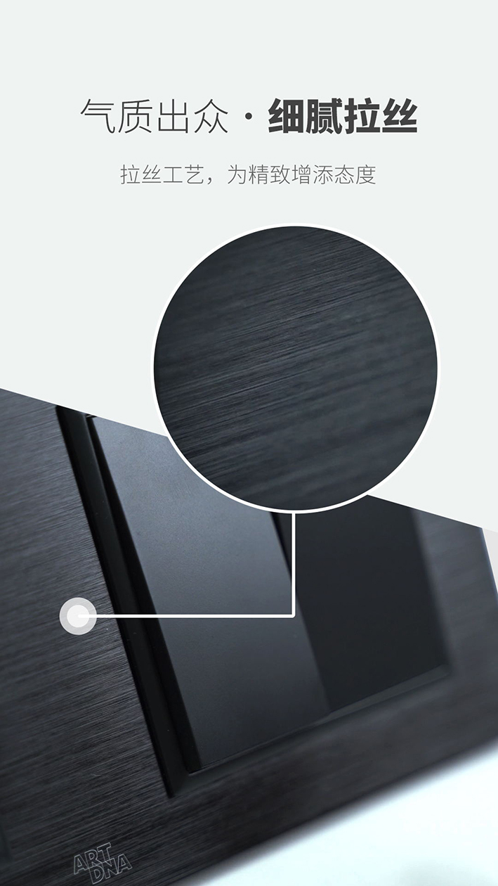 这款开关全名为A77拉丝黑联体开关,面框采用厚铝材质,表面采用拉丝工艺,触感细腻有质感,配以百搭的黑色,有一股扑面而来的尊贵气质!安装在客厅、卧室、阳台、酒店、别墅等多个地方都十分百搭。
