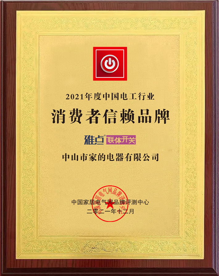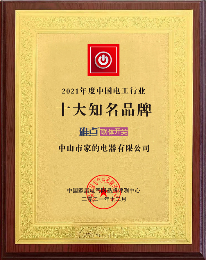 在家居电气电工类品牌评选中,2021年度中国电工行业“十大领军品牌”、“十大知名品牌”、“消费者信赖品牌”、“家装优选品牌”、“房地产优选品牌”等奖项隆重揭晓。雅点开关荣膺“2021年度中国电工行业十大知名品牌”“2021年度中国电工行业消费者信赖品牌”。