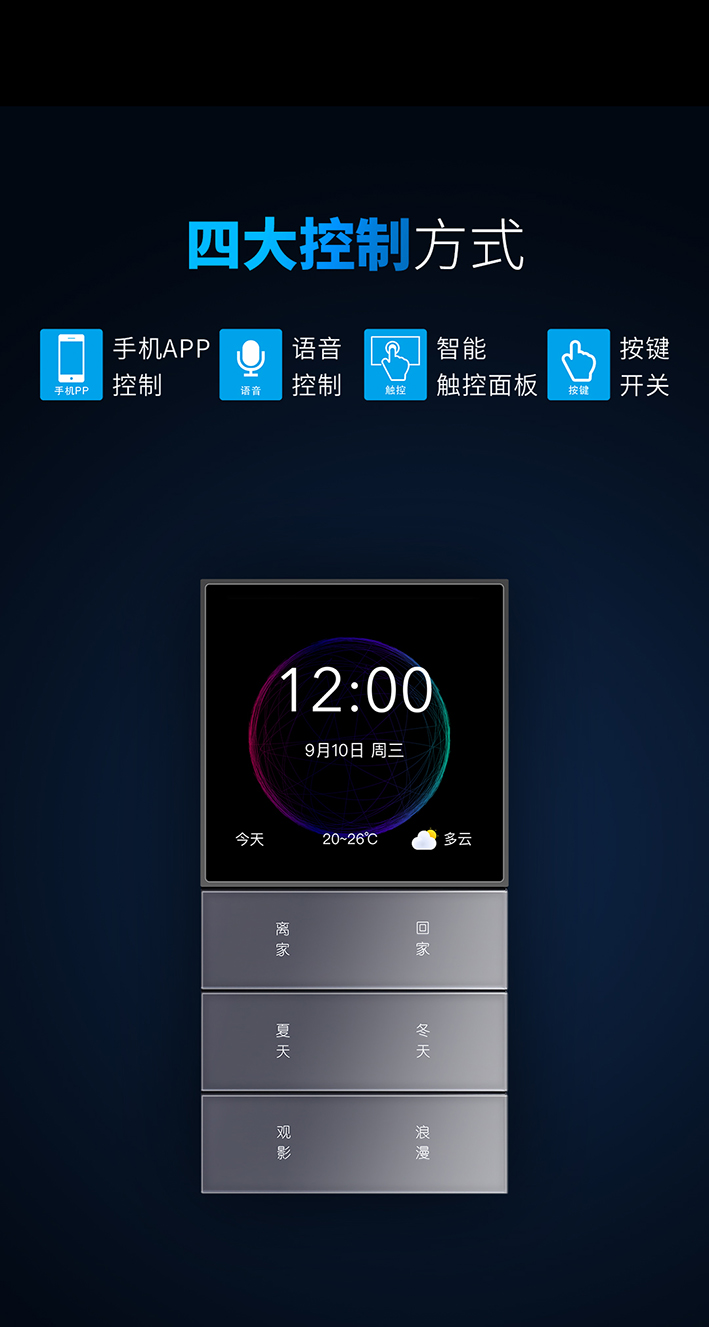 3、四大控制方式。手机APP控制、触摸屏控制、语音控制、按键控制。