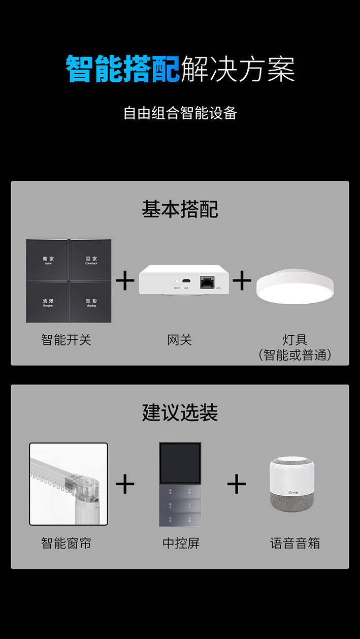5、智能搭配解决方案。用户可根据实际需求搭配硬件。基本搭配:智能开关+网关+灯具(智能或普通);建议选装:智能窗帘、中控屏、语音音箱。