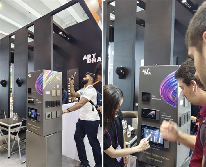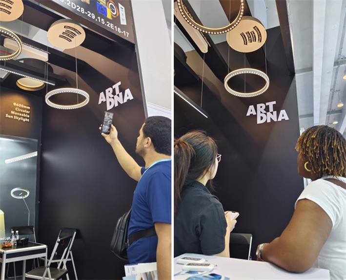 智能旋转柜前总是人声鼎沸,对雅点智能产品更是兴致勃勃。雅点业务员也乐此不疲地演示和解释控制原理,配合现场智能灯具实现联动控制,实现灯光氛围灯场景切换。客户们纷纷掏出手机拍摄。